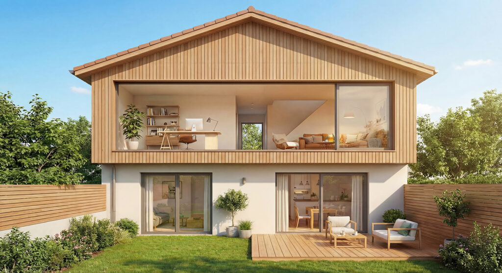 La surélévation en ossature bois est la solution la plus intelligente pour agrandir votre maison sans emprise au sol, sans sacrifier votre jardin, et en valorisant fortement votre patrimoine.